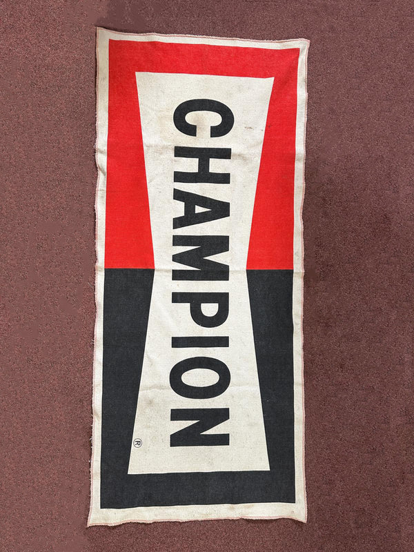 This Champion rug is a strong example of mid-to-late 20th century workshop advertising, reflecting a time when major automotive brands extended their identity beyond walls and counters into every practical aspect of the garage environment.