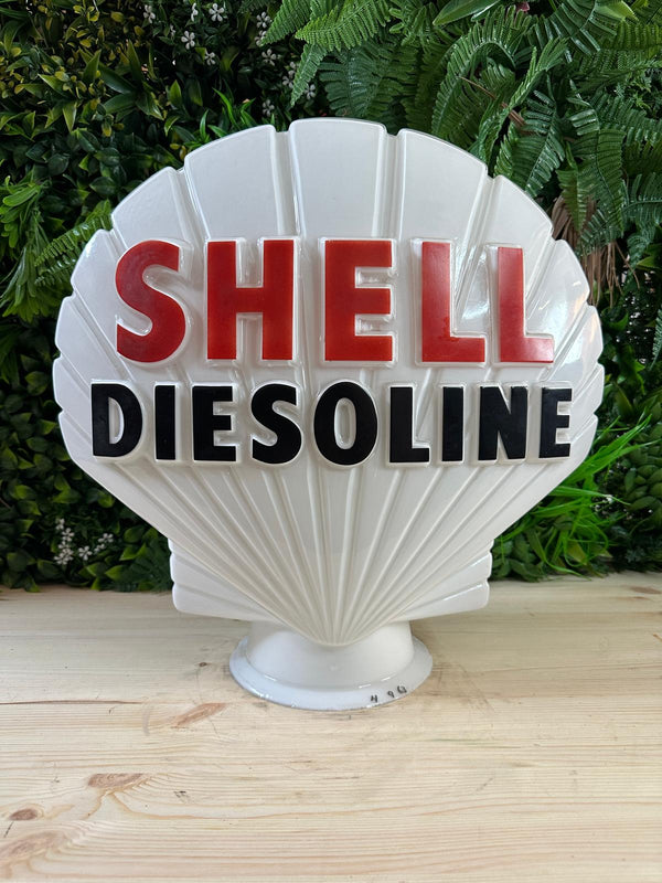 This striking Shell “Diesoline” glass petrol pump globe is an original-style forecourt advertising piece designed to sit atop fuel pumps, instantly identifying the fuel brand and grade to passing motorists. With its bold lettering and distinctive shell-fan form, globes like this were an essential part of early to mid-20th-century petrol station design.